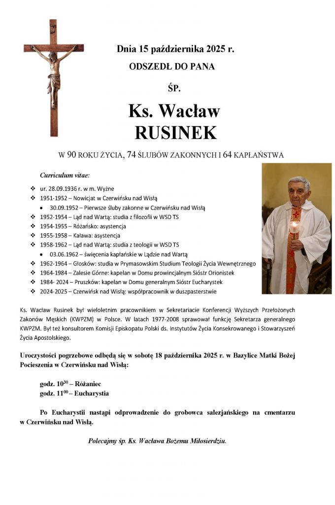 Z ogromnym żalem informujemy, że w dniu dzisiejszym zmarł Ks. Wacław Rusinek, który przez 40 lat był jednym z członków naszego domu zakonnego w Głoskowie. Dziękujemy mu za wieloletnią posługę. Wierzymy, że dobry Bóg przyjmie go do grona zbawionych.